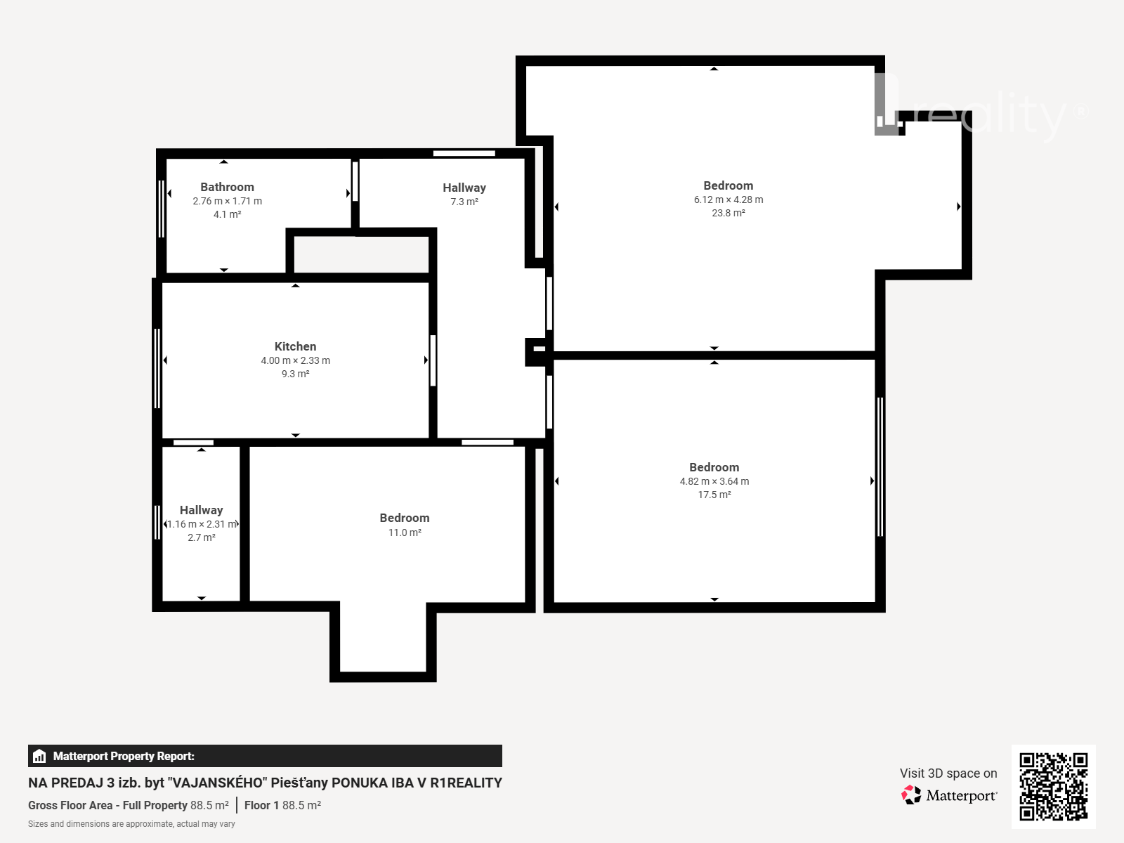 Ponúkame na predaj investične zaujímavý, veĺký 3 izbový byt v blízkom centre kúpeľného mesta Piešťany, na ulici Vajanského. Byt má výmeru až 81,25 m2, dispozične pozostáva z 3 obytných miestností, samostatnej kuchyni s veľkou komorou a príslušenstvom (kúpeľňa s vaňou, samostatné WC, chodba). Byt je v pôvodnom stave, vyprataný, riadne pripravený k okamžitej rekonštrukcii, alebo k okamžitému nasťahovaniu. Tento výnimočný svetlý a priestranný byt sa nachádza na bezpečnom vyvýšenom 1. poschodí bytového domu, ktorý sa nachádza na vlastnom pozemku (podielovo vlastnia iba vlastníci bytu, takže parkovanie je zadarmo, nie mestské), energetické náklady činia cca190,-€. Kúrenie je zabezpečené vlastným plynovým kotlom. Byt je výnimočne svetlý a teplý, obojstranne situovaný-okná spálne na juh s balkonom číslo 1, obývacia izba s balkónom číslo 2 východnej orientácie poskytuje výhľad na zeleň pred domom. K bytu prislúcha parádna veľká murovaná pivnica. Možnosť okamžitej realnej obhliadky bytu na originálnom webe r1reality.sk.