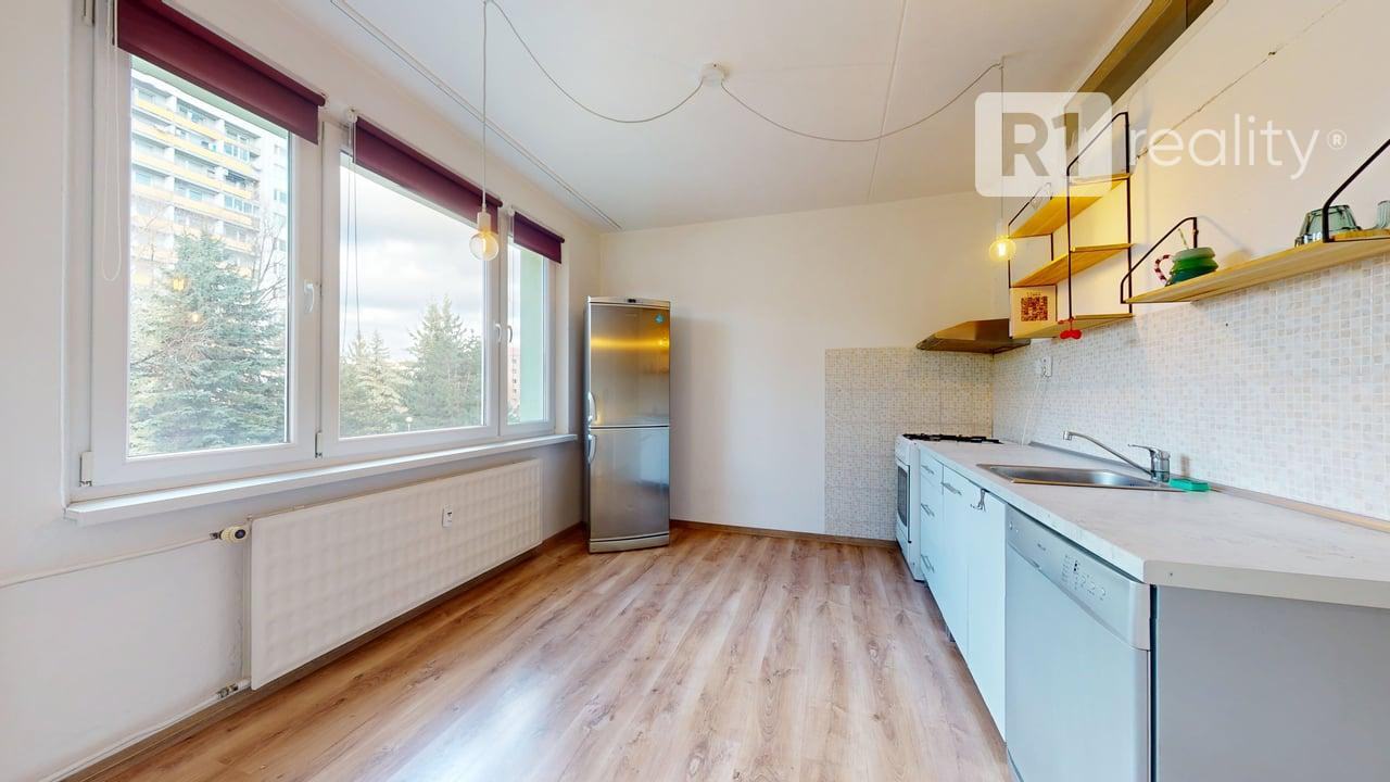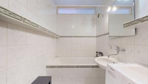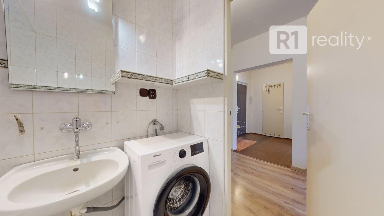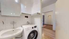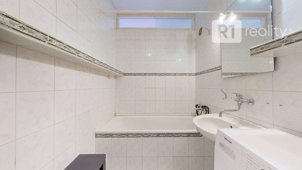 kuchynská linka na báze dreva (dĺžka cca 2,6 m), automatická umývačka riadu, kombinovaný sporák (plynová varná doska + elektrická rúra), digestor, keramický obklad, kúpeľňa s vaňou, keramický obklad, ventilátor, samostatné WC s odvetraním