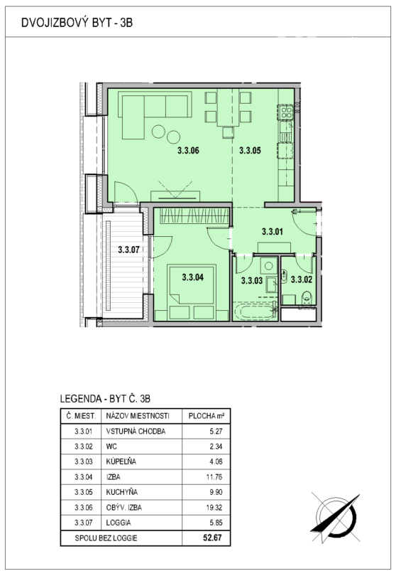 Jedná sa o 2 izbový byt výmery 52,67 m2, situovaný uprostred uličného krídla (V-Z orientácie) na 3 NP polyfunkčného domu s výťahom. Byt je prakticky dispozične riešený, pozostáva z priestrannej, slnečnej dennej časti západnej orientácie a spálne s loggiou výmery 5,85 m2 západnej orientácie. K bytu prislúcha pivničná kobka výmery 3,51 m2, situovaná na rovnakom podlaží v bezprostrednej blízkosti bytu. V cene bytu je zahrnuté vyhotovenie bytu v štandarde (podlahy, interiérové a vchodové bezpečnostné dvere, omietky, obklady, sanita v kúpeľni a WC) a jedno vonkajšie parkovacie miesto, situované v nádvorí.
